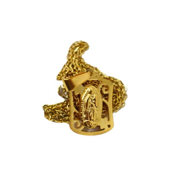 Medalla metálica dorada de La Virgen de Guadalupe con cadena.